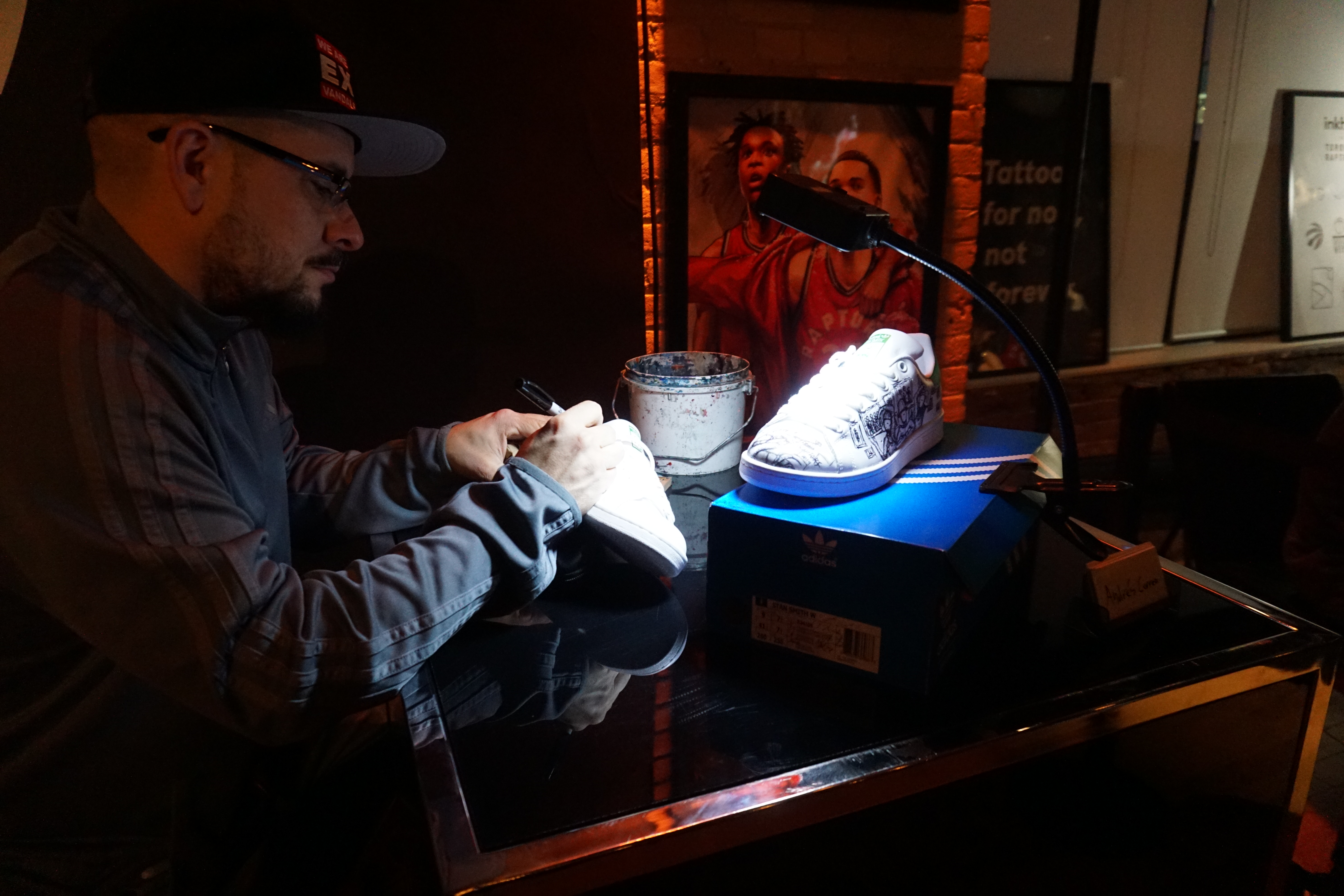 As shown above, there was a large video screen playing cool animations and Raptor highlights throughout the years. Another cool set up was the Martk’d sneaker customization presented by Adidas. Stan Smith’s never looked better as there was a lot of cool art displayed on the shoes that Raptors fans will love.